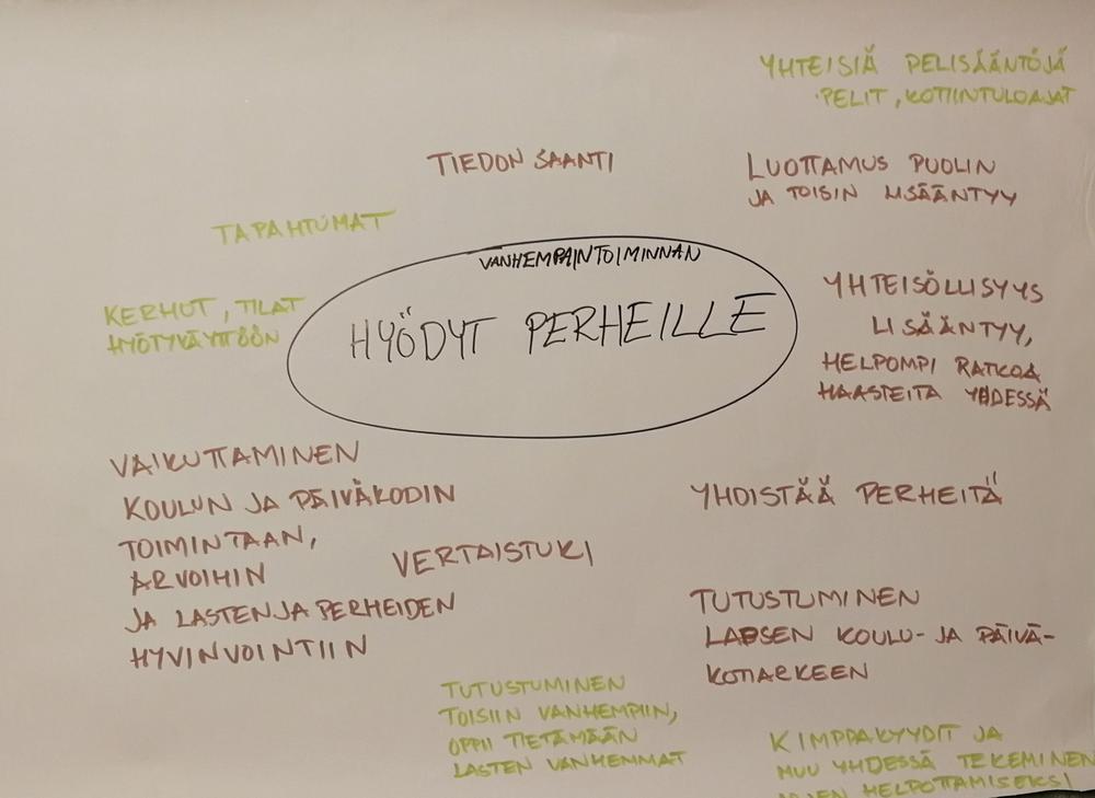 Iltamien toiminnallisessa osuudessa osallistujat jakautuivat ryhmiin pohtimaan vanhempaintoiminnan hyötyjä perheiden, päiväkoti- ja kouluyhteisön sekä johtajuuden kannalta. Ideariihien aikana jaettiin kokemuksia hyvistä käytännöistä ja keskustelu oli vilkasta. Ideariihien tuotokset vanhempaintoiminnan tueksi löytyvät uutisen kuvista ja Yhdistys-sivun alaosan tiedosto-osoista.